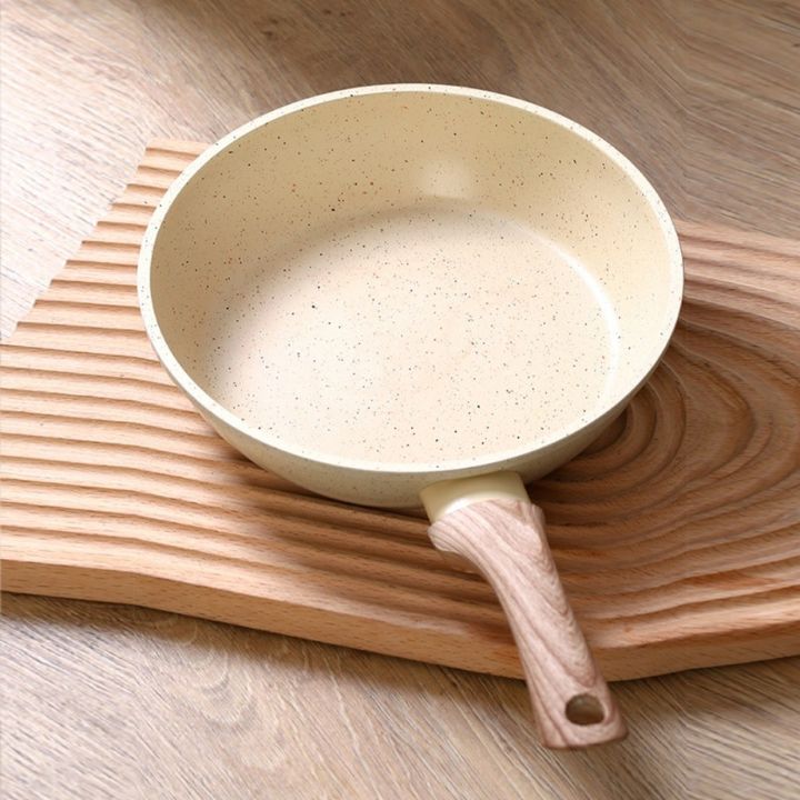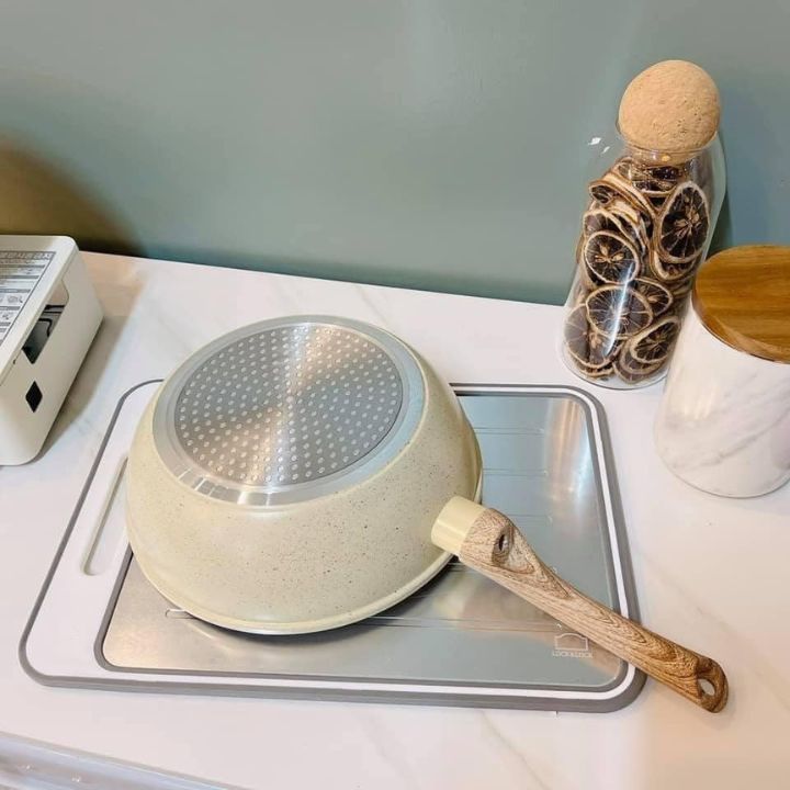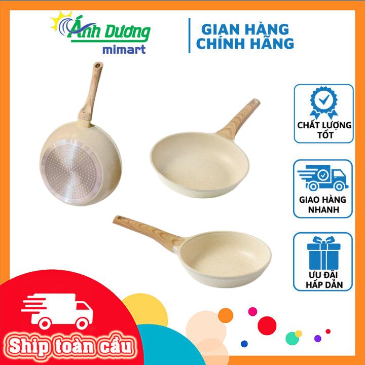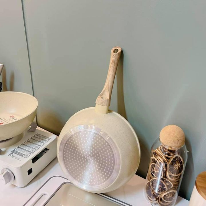 Chảo Vân Đá Chống Dính Sâu Lòng Emoojoo Kiểu Nhật Chảo Xào Nấu Màu Kem Cán Gỗ Sang Trọng