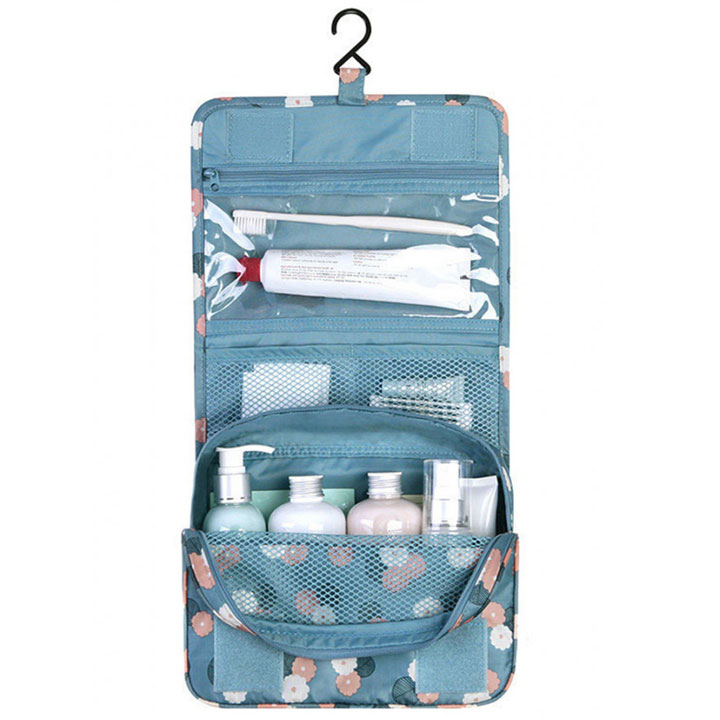 + Chất liệu tốt không thấm nước, có móc treo tiện lợi + Túi có thể đựng mỹ phẩm, đồ trang điểm, bàn chải đánh răng, kem đánh răng, dầu gội,... + Bên trong túi được chia làm nhiều ngăn nhỏ để có thể đựng và bảo quản được nhiều món đồ hơn. + Kích thước gấp gọn: 26x16x6cm, kích thước mở rộng: 64.5x26x6cm
