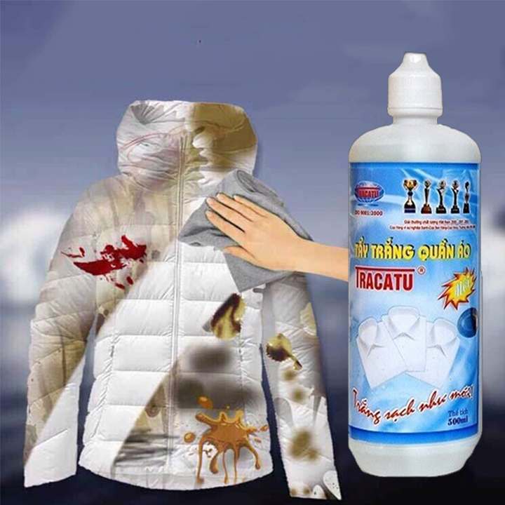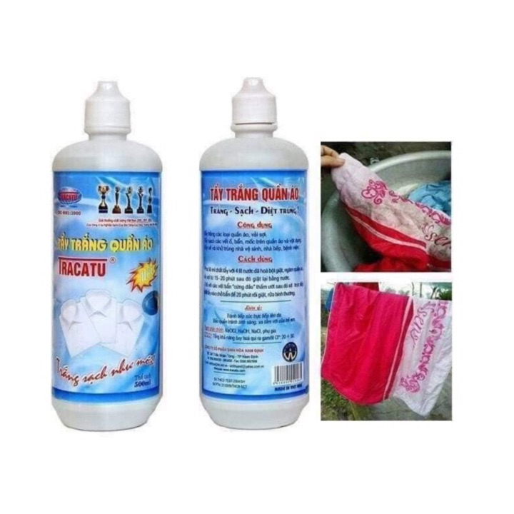 ☑️ Pha 50 ml tẩy trắng quần áo TRACATU cực mạnh với 4 lít nước đã hòa bột giặt, ngâm quần áo, vải sợi từ 15÷20 phút sau đó giặt lại bằng nước.