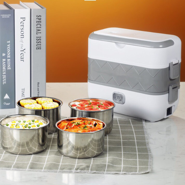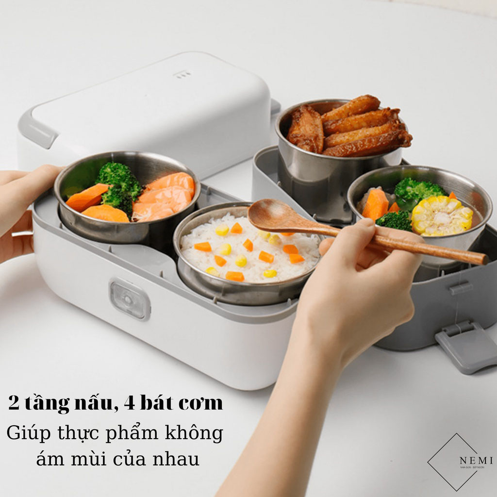 - Hộp cơm bao gồm 2 tầng và 4 hộp inox không gỉ, giúp phân chia đồ ăn và nấu tiện lợi hơn
