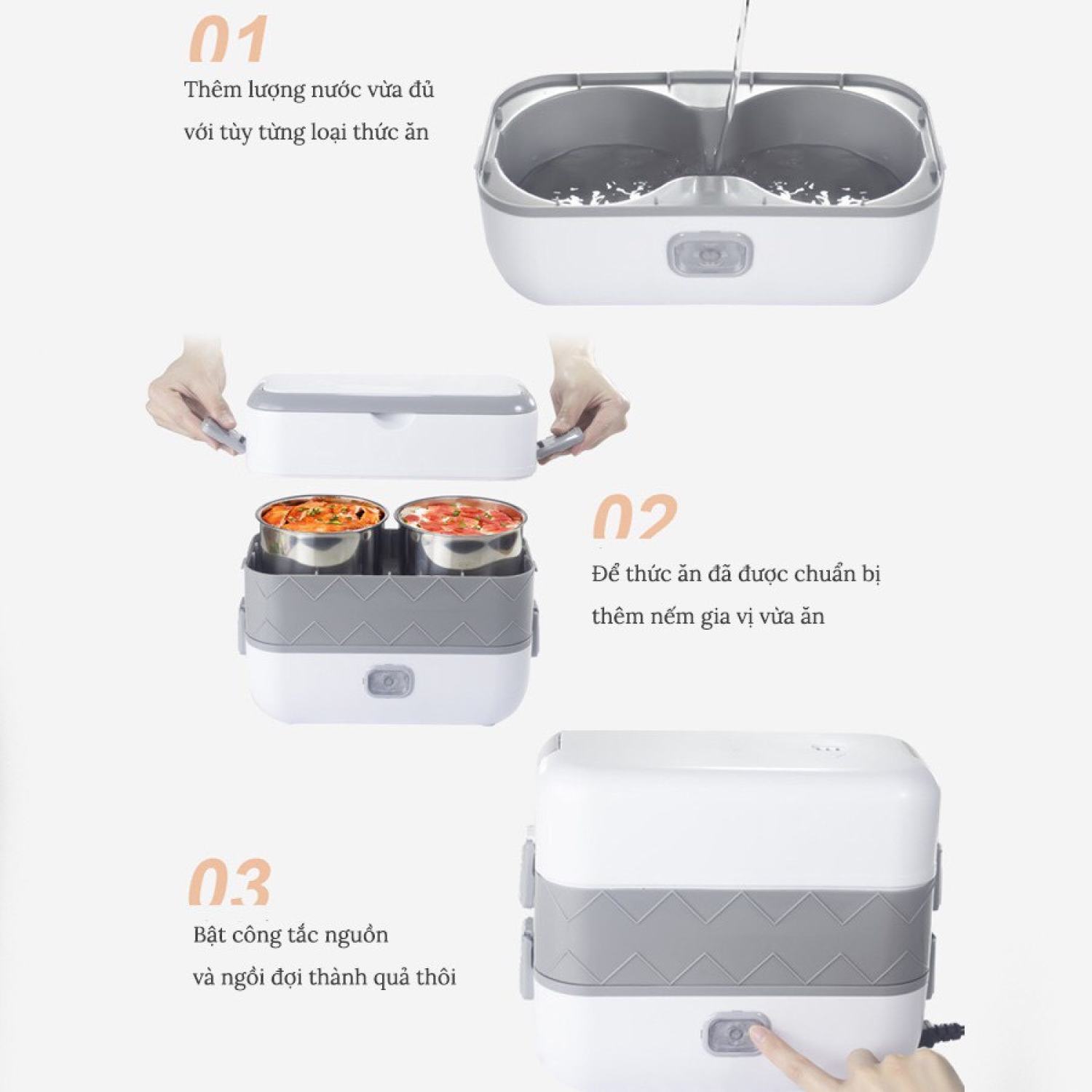 - Hộp cơm điện văn phòng cá nhân được thiết kế tiện lợi và đa năng hơn những chiếc hộp cơm truyền thống, không những có khả năng hâm nóng đồ ăn mà việc nấu chín thức ăn, nấu cơm, hấp tôm thịt, chưng trứng, nấu canh,... cùng một lúc chỉ với chiếc hộp cơm 2 tầng này