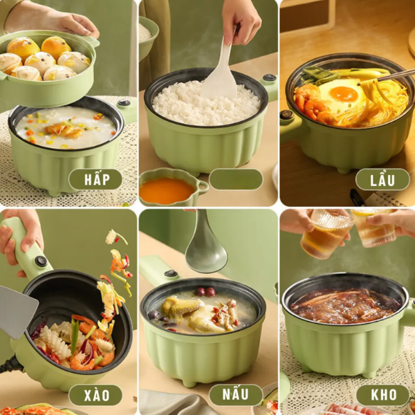 - Nồi lẩu điện mini giúp bạn nhanh chóng có được những món ăn ưa thích như: mỳ phở ăn liền, lẩu, các món kho và luộc, nấu cháo, hâm nóng thức ăn, đun nước, chiên xào...